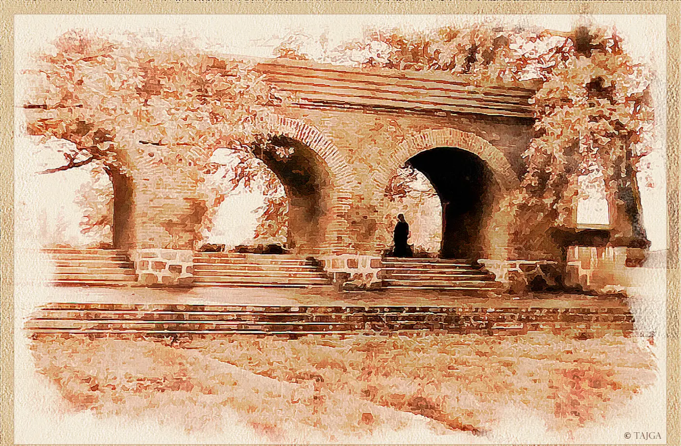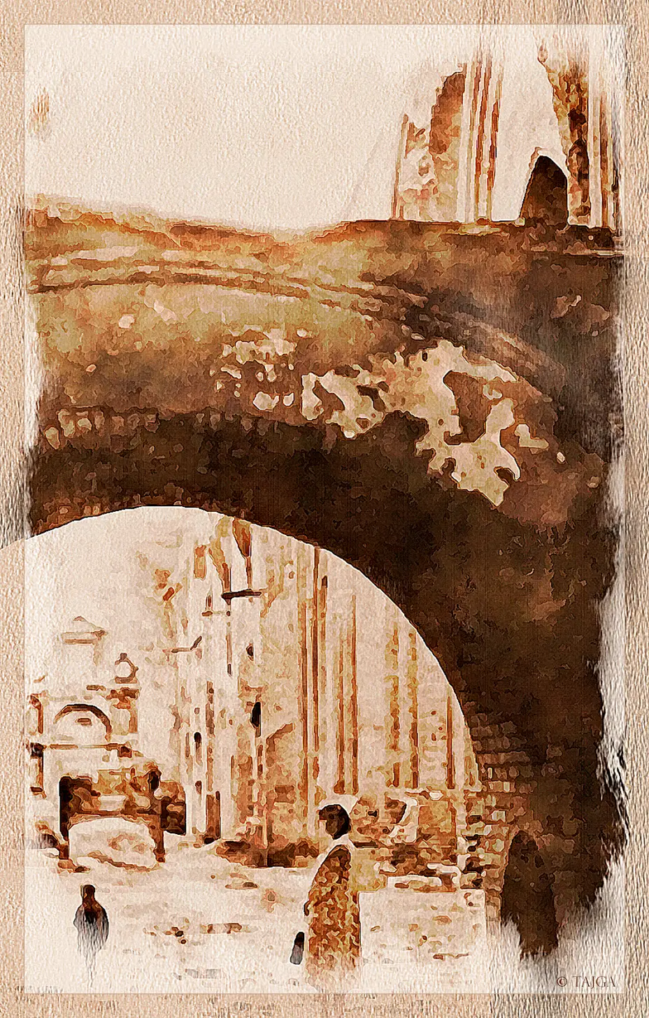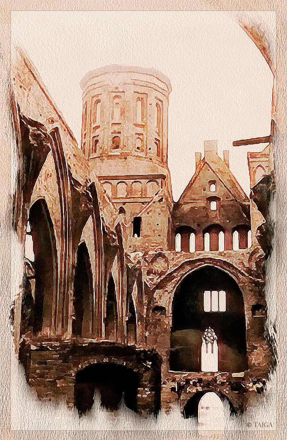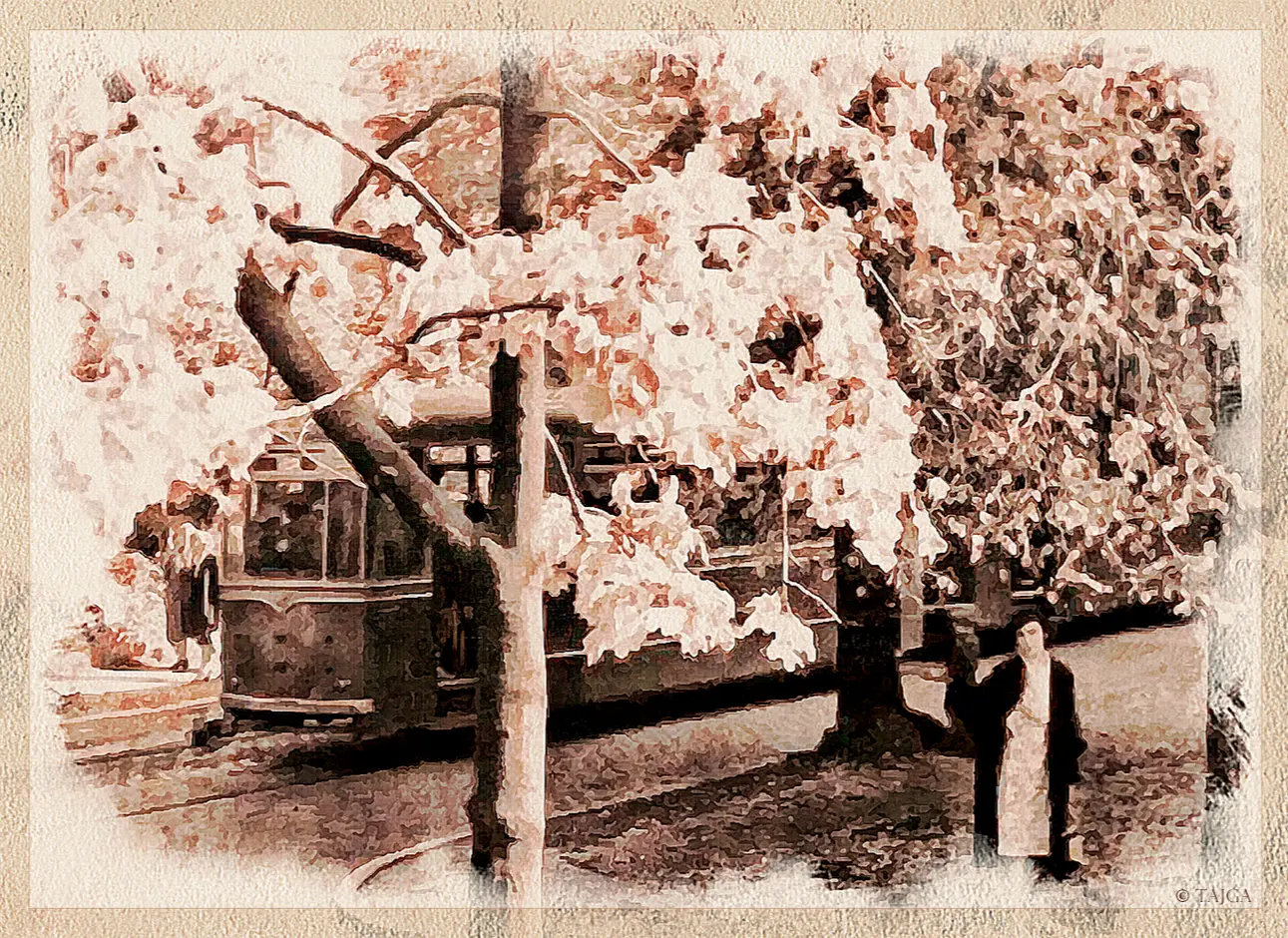 ...Начинают умирать полуторавековые деревья, в парках появляются обширные пни, мох сиротеет; я вижу: город покидают охраняющие его дриады. Пора сажать новое, – спохватываются власти. На Московском проспекте появляются русские берёзы юного возраста, а рядом с широкоплече-обезглавленными романскими мужскими силуэтами прежних домов торопливо растут высотки, переполненные сквозняками, – удобная архитектура массового быта. Поговаривают о реставрации кафедрального собора и даже начинают подвозить к охраняющим сон спящих рыцарей стенам цемент и литой багряный кирпич.
