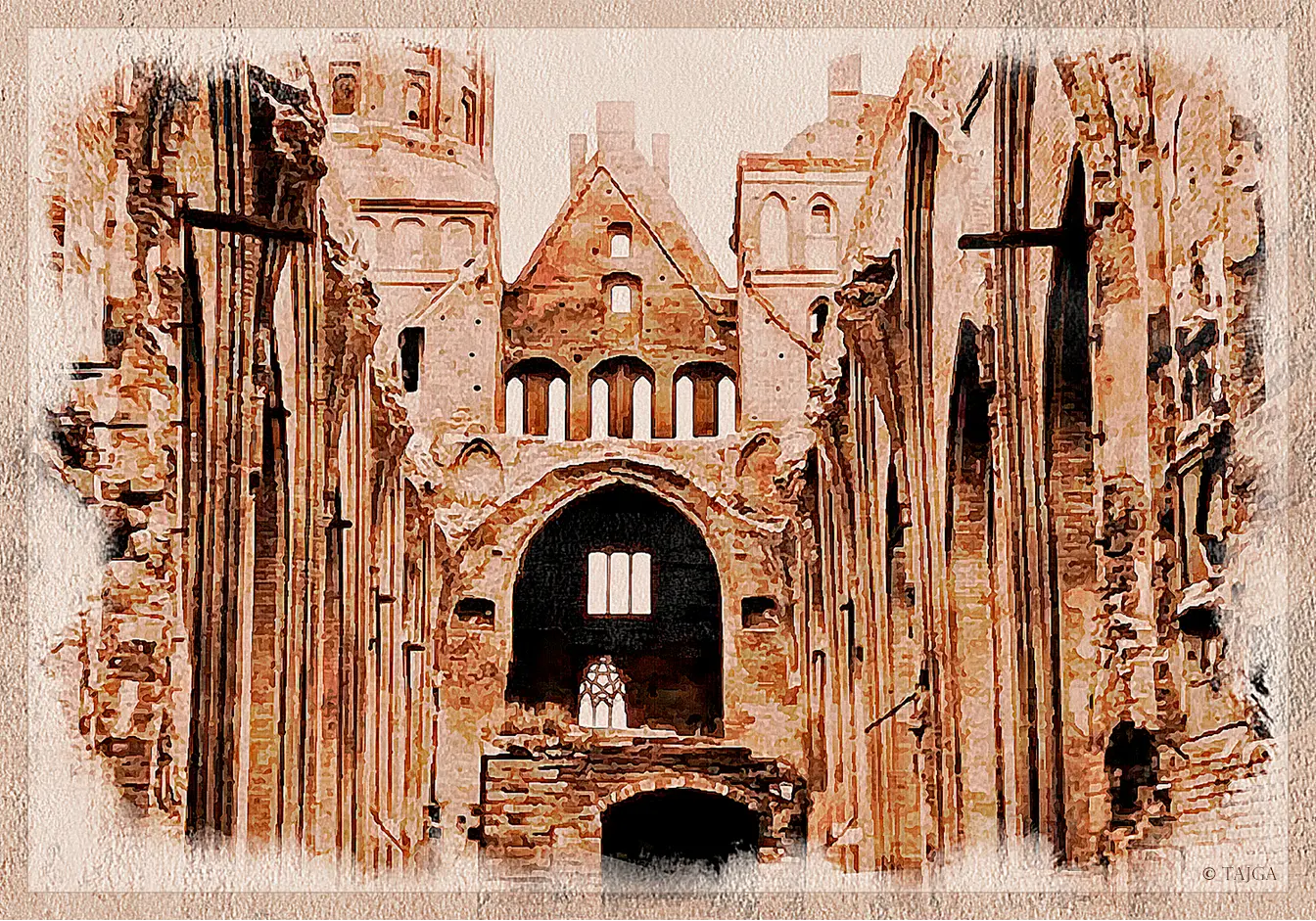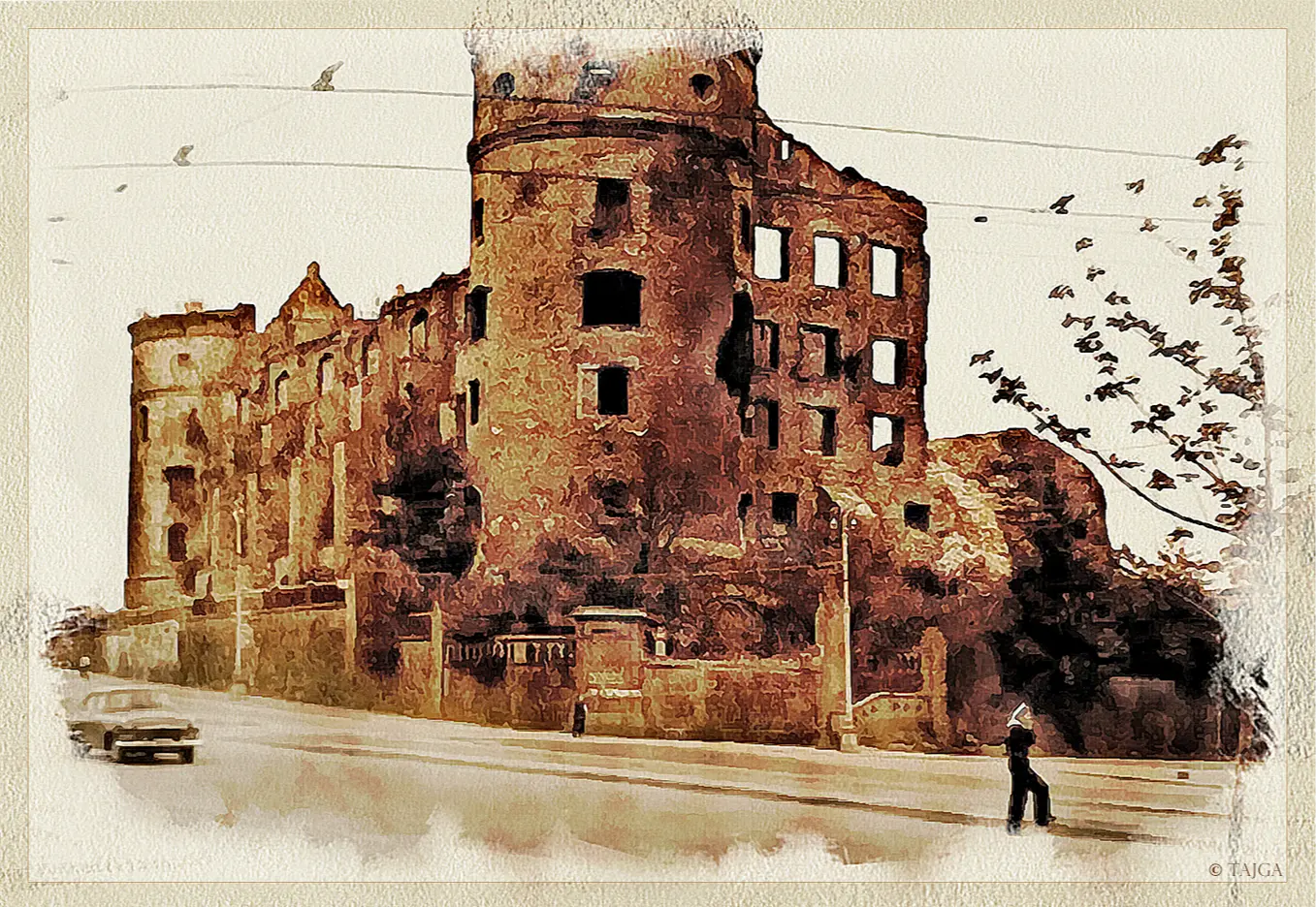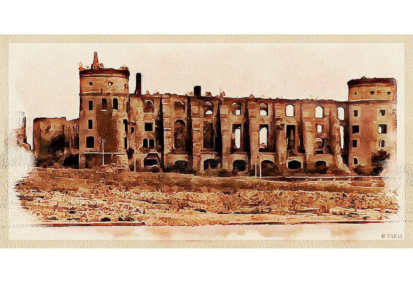 ...В центре Калининграда послевоенные развалины, они ещё долго будут зиять, несмотря на осваивающихся на иной земле россиян. Даже я, двадцать лет спустя, ещё застану страшные увечные дома, и один мне запомнится обнажённой драмой: единственная стена, на высоте второго этажа – унитаз из немецкого фаянса, ветер качает маятником вдоль кирпичей слепую цепь, а под ним надпись "Дойдем до Берлина!"