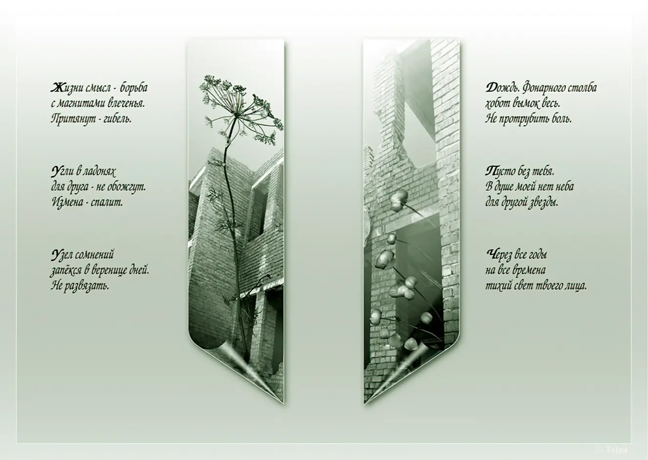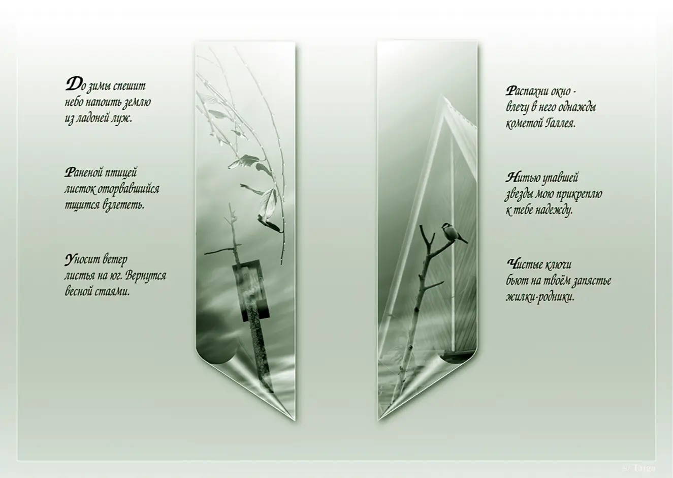 Когда исходное поэтическое наполнение было полностью подготовлено, началась уже моя непосредственная работа с книгой: ей нужно было придать уникальное лицо. Все три потока – авторский текст, символический иллюстративный ряд – разделительные полнополосные иллюстрации, начинающие новые разделы в книге (они еще будут предложены внимаю читателя-зрителя), – само построение книги (её структуру) – нужно было совместить в единый живой организм.