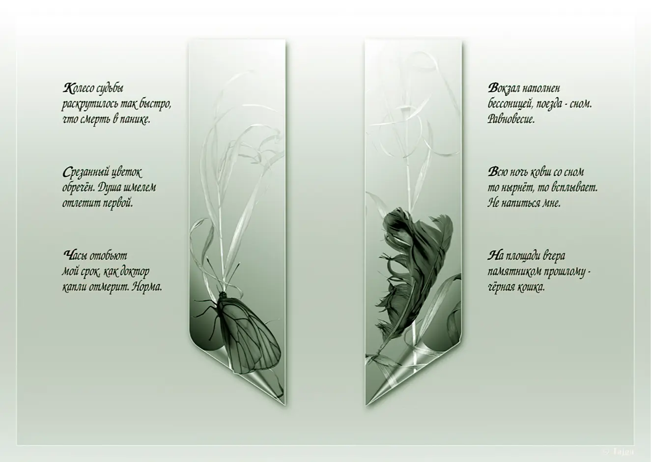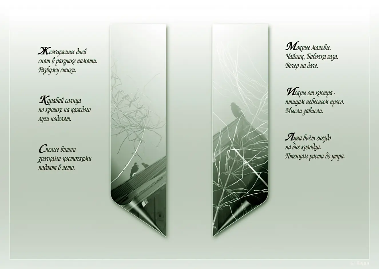 Что касается хайку – трёхстиший Лилии Кликич – они вылились в отдельный небольшой раздел "Коллекция хайку" внутри книги, по сути эти хайку – книга в книге и её особая медитация. Остальные, не-хайку, стихи создавали предваряющее поле для восприятия, своего рода среду, сгущающую воздух, чтоб возможен стал необусловленный полёт. Лёгкие и улётные хайку – какими они нам кажутся по наивности, – на самом деле в восточной поэзии форма очень жёсткая и канонически строгая.